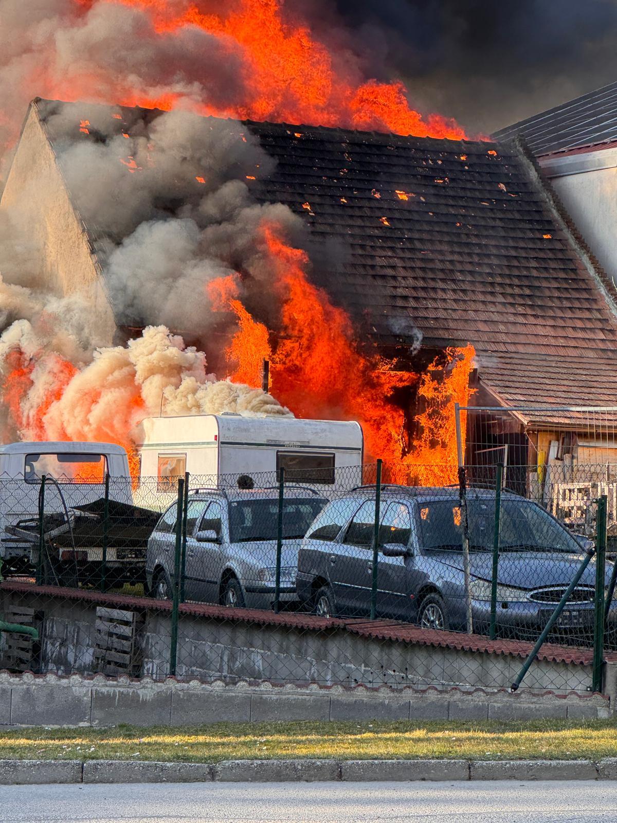Ein Wirtschaftsgebäude stand in Vollbrand, wobei der Brand auf einen beim Gebäude abgestellten Wohnwagen und eine nebenan befindliche Halle übergegriffen hatte. Die auf dem Dach der Halle befindliche Photovoltaikanlage war schon stark beschädigt, ebenso kam es zu mehreren lautstarken Explosionen, weshalb der Einsatzleiter auf Alarmstufe B4 erhöhte.